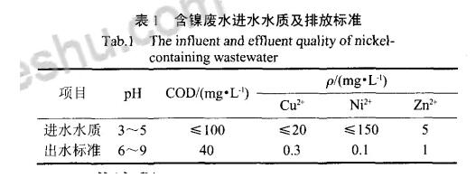 各企業(yè)生產(chǎn)的廢水統(tǒng)一排放收集到廢水處理設(shè)備廠,按照不同的處理方法進(jìn)行分股分類,其中含鎳廢水的水質(zhì)情況及出水標(biāo)準(zhǔn)如下圖所示。