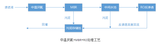 滲濾液通過調(diào)節(jié)池流入到中溫厭氧池,經(jīng)大分子有機污染物降解后進入缺氧段MBR反應器中,與回流水混合進入好氧段MBR進行曝氣,去除滲濾液中的TN,好氧池出水進入MBR分離器,將分離的污泥濃液回流至MBR缺氧段,MBR出水進入反滲透系統(tǒng),滲濾液經(jīng)反滲透處理后實現(xiàn)達標排放。